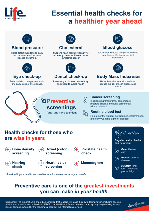 Preventive health checks play an important role in detecting potential health issues early, often before symptoms appear. Regular screenings, including blood pressure, cholesterol, glucose, vision and dental checks, help identify risks that could develop into chronic conditions. By staying proactive and keeping your health in check regularly, you increase your chances of preventing illness and safeguarding your long-term well-being.
